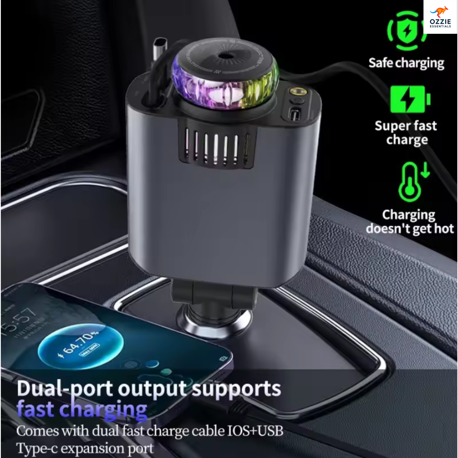 π Features USB-C / Type-C ports and dual cables, letting you charge three devices at once β ideal for families and rideshare drivers.
